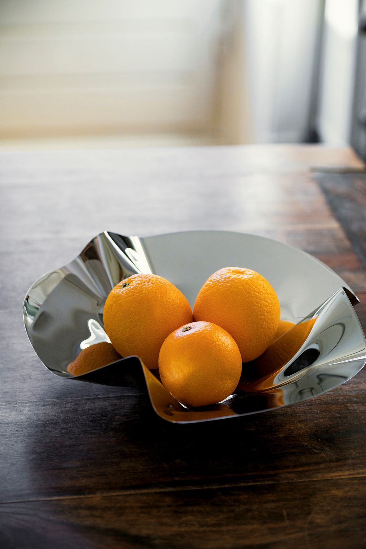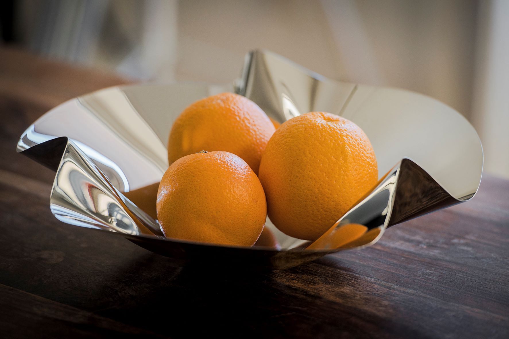 Ob als Obstschale, saisonal dekoriert oder ganz für sich - diese auf Hochglanz polierte Designer Schale namens MARGARETHE zieht alle Blicke auf sich.